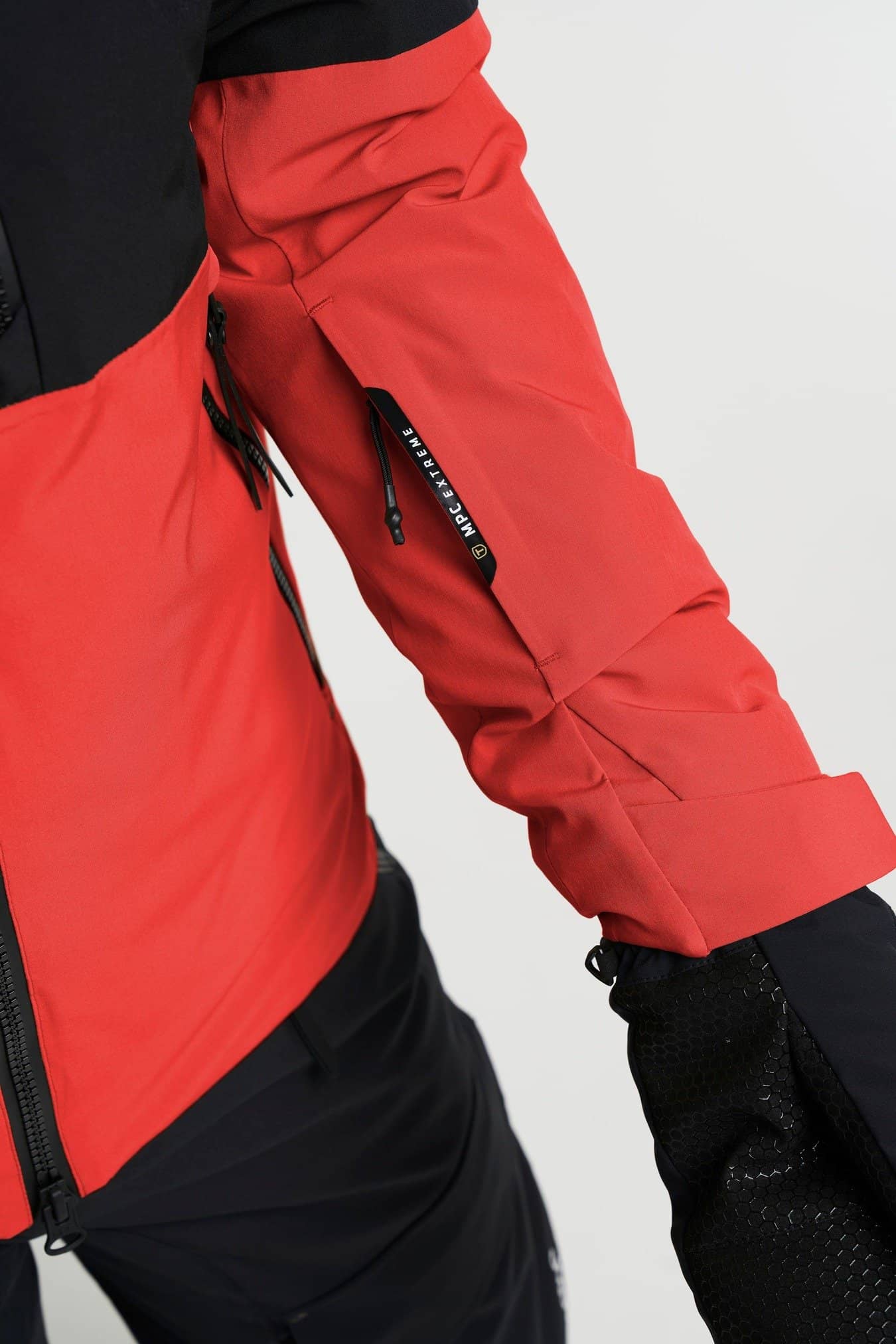 Lightly Lined Ski Jacket Yoke MPC Extreme is a lightly lined ski jacket in a nice, stretchy material. The stretch material makes it flexible and gives you the optimal conditions to move freely. The high collar protects your cheeks, and is fleece lined to keep your face nice and warm. You can adjust the hood both vertically and horizontally for the optimal fit and to make room for a helmet. The jacket is both wind and waterproof, with sealed seams and a water repellent zip. It has a snow skirt that can easily be removed with a zip. The hood is also removable if you prefer to be without and both the arms and the hem are adjustable for an optimal fit. The jacket has extra ventilation under the arms, the pockets are fleece-lined, and there's a special pocket for your ski pass. The jacket is available in four colours, where the red, turquoise, and white models are black on top and the black model is full black.