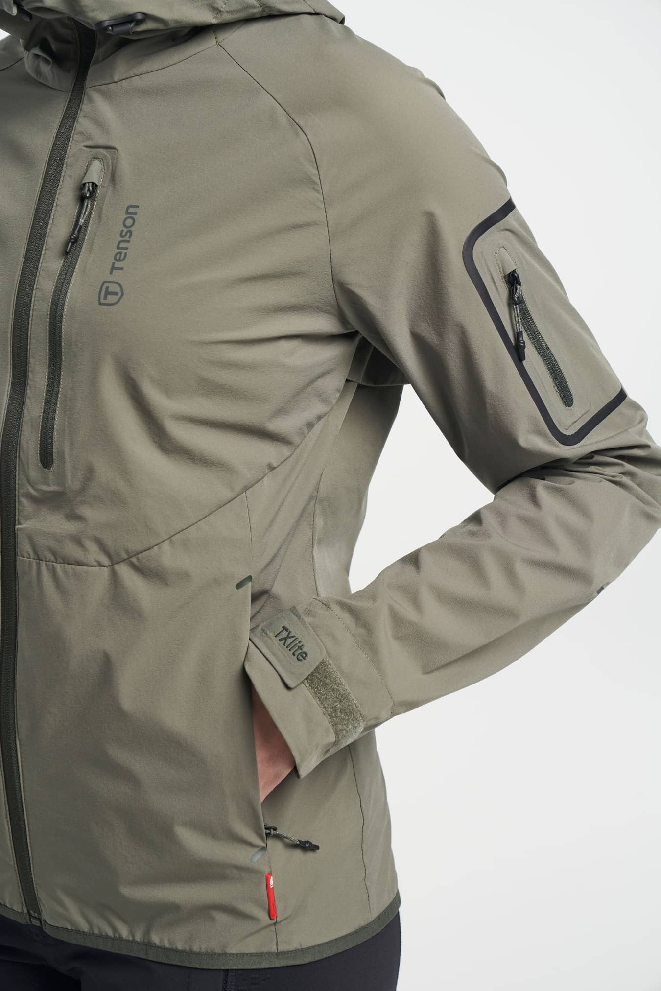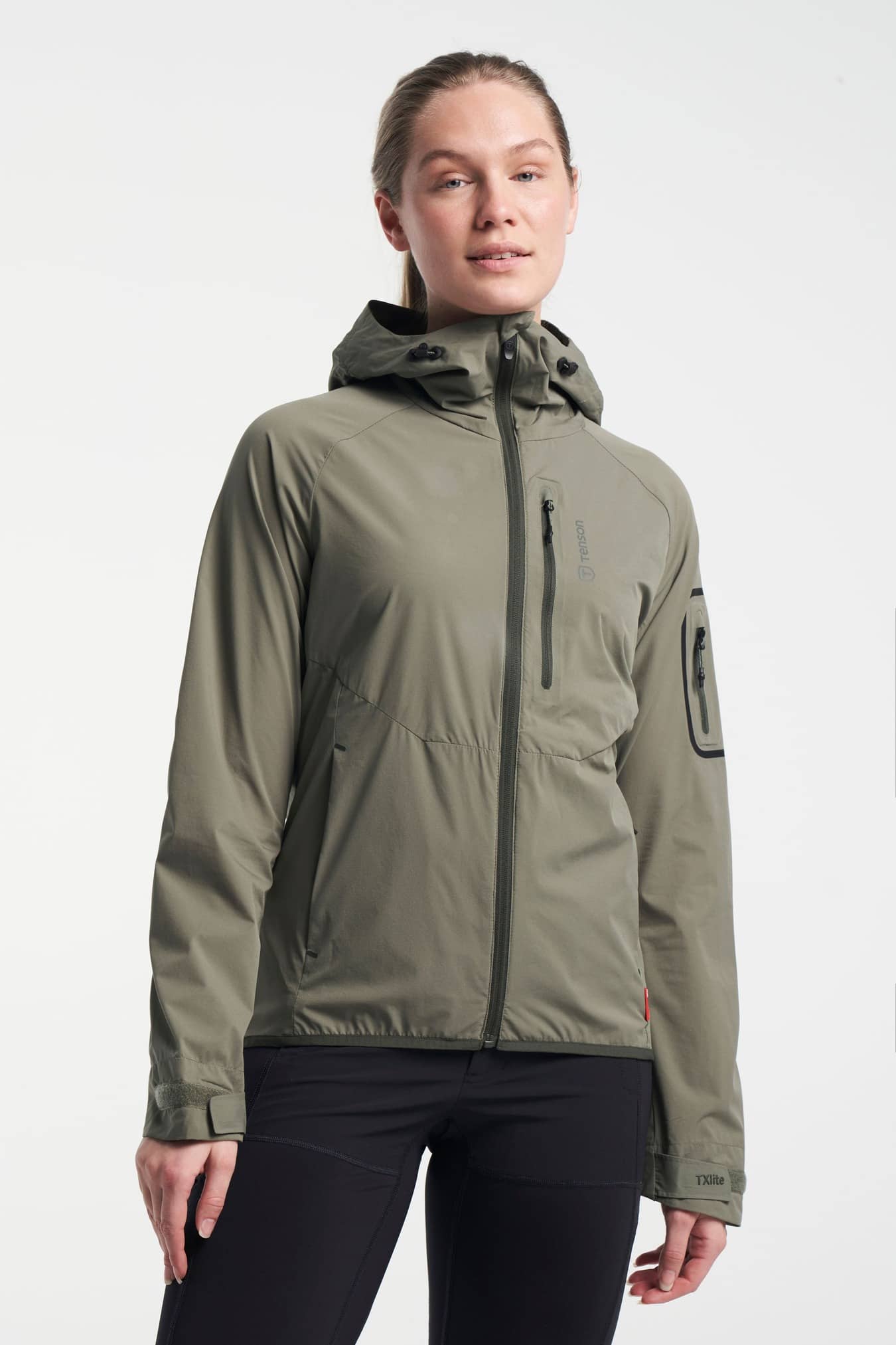 TXlite Light Jacket Women A highly functional lightweight stretch jacket perfect for your next adventure that is easy to pack. The TXlite Light jacket is a perfect windproof and water-resistant jacket to bring when the weather is a bit unpredictable. It has an adjustable hem, cuffs and hood and several zip pockets, reflective details and ventilation. Comes with a PFC free water-repellent finish.