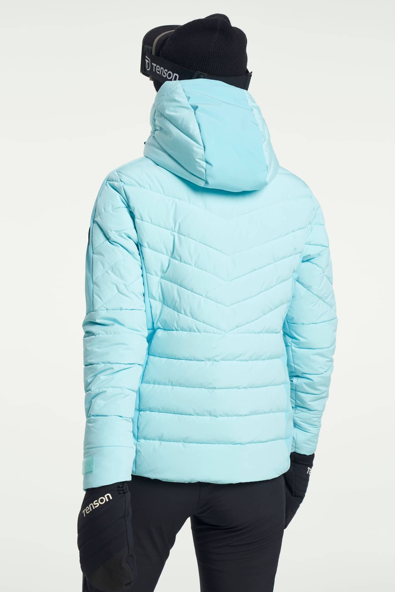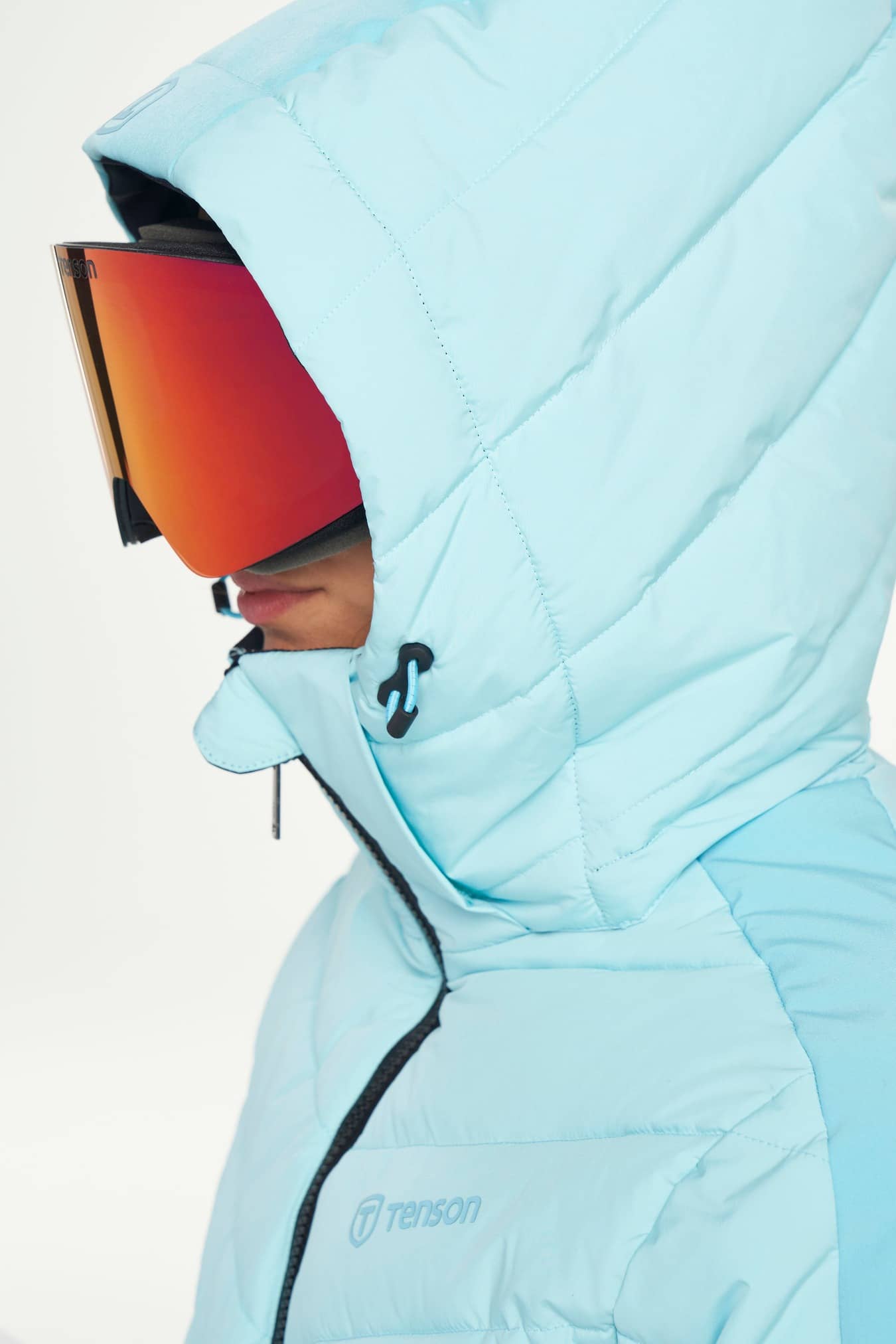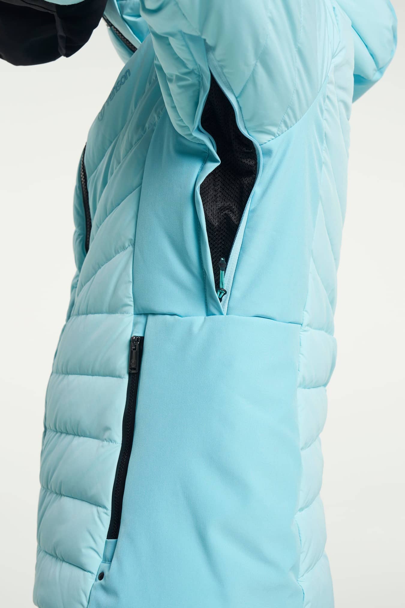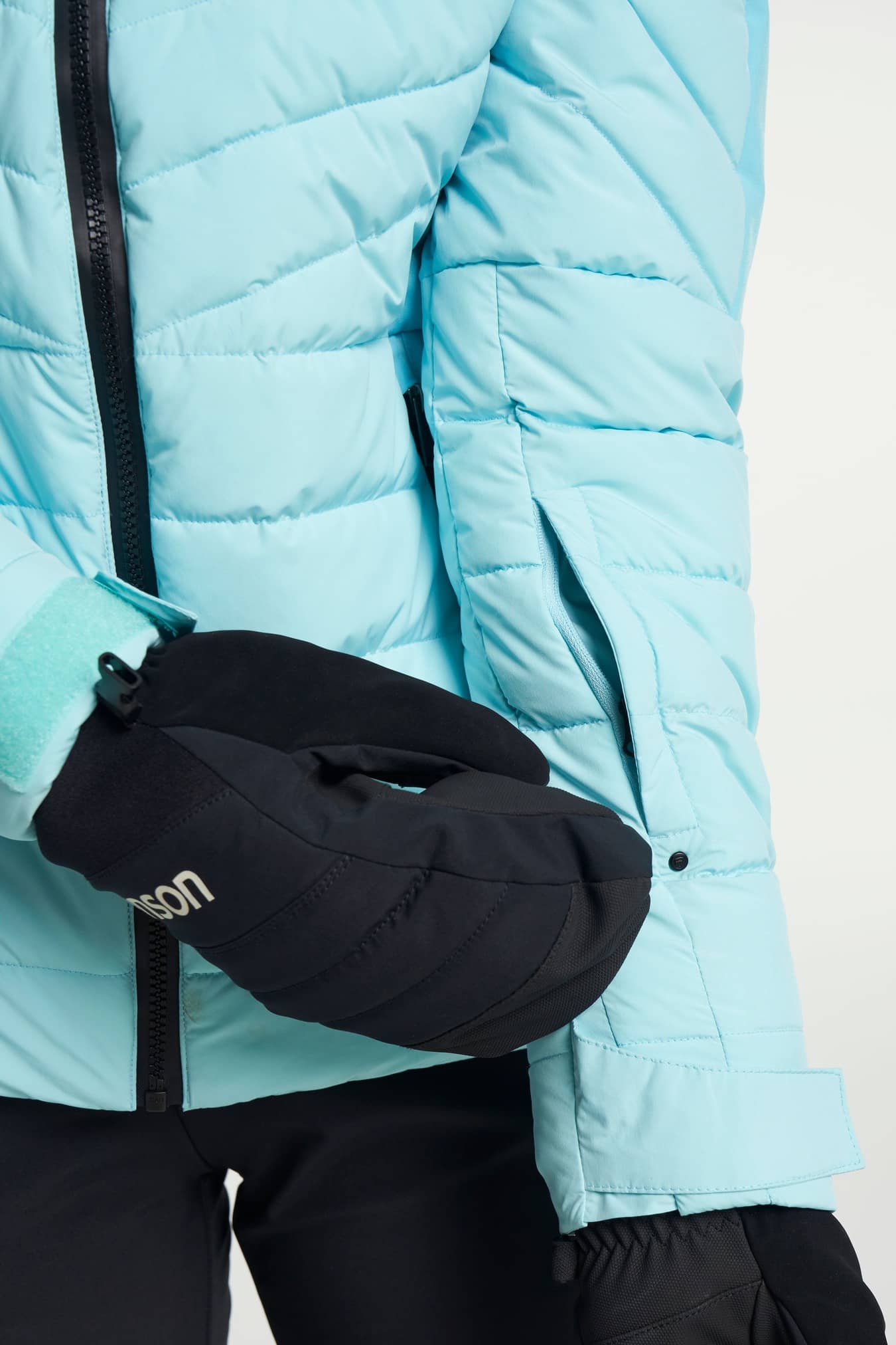 Ski chique - our Grace Ski Jacket with its feminine elegance and generous, warming insulation and smart details provides a genuine stylish look. Powered with AirPush™ Insulate that provides vapor management while maintaining warmth – keeping you cozy and warm in any temperature. The jacket has a tailored fit and stretch side panels to get a smooth and freedom-of-movement feeling that enhances every turn. Features a detachable hood and snow gaiter, adjustable cuffs, ventialition under arms, inner pocket with zip and a ski pass pocket. Comes with E-dye polyester lining and a PFC free water-repellent finish.