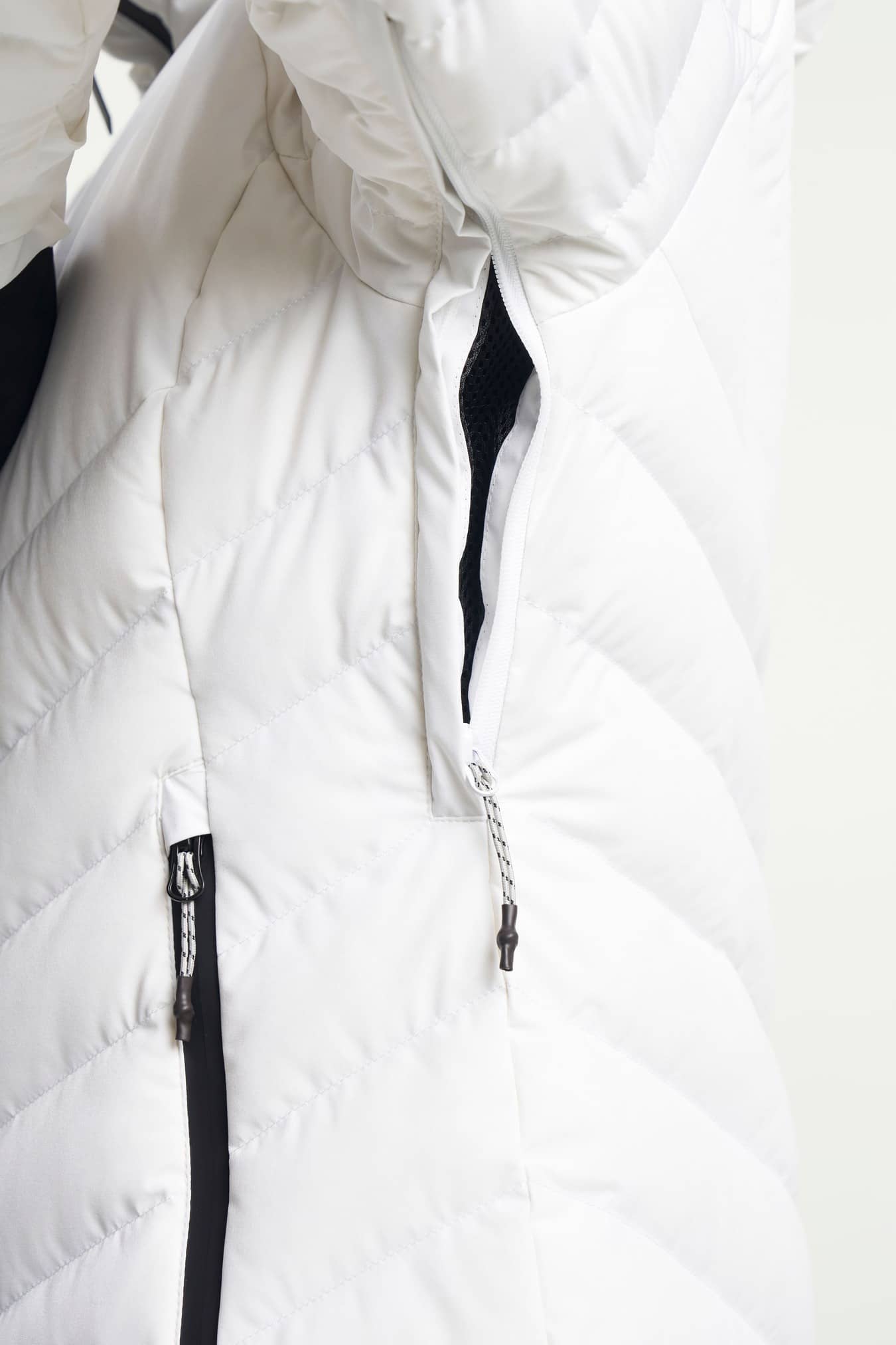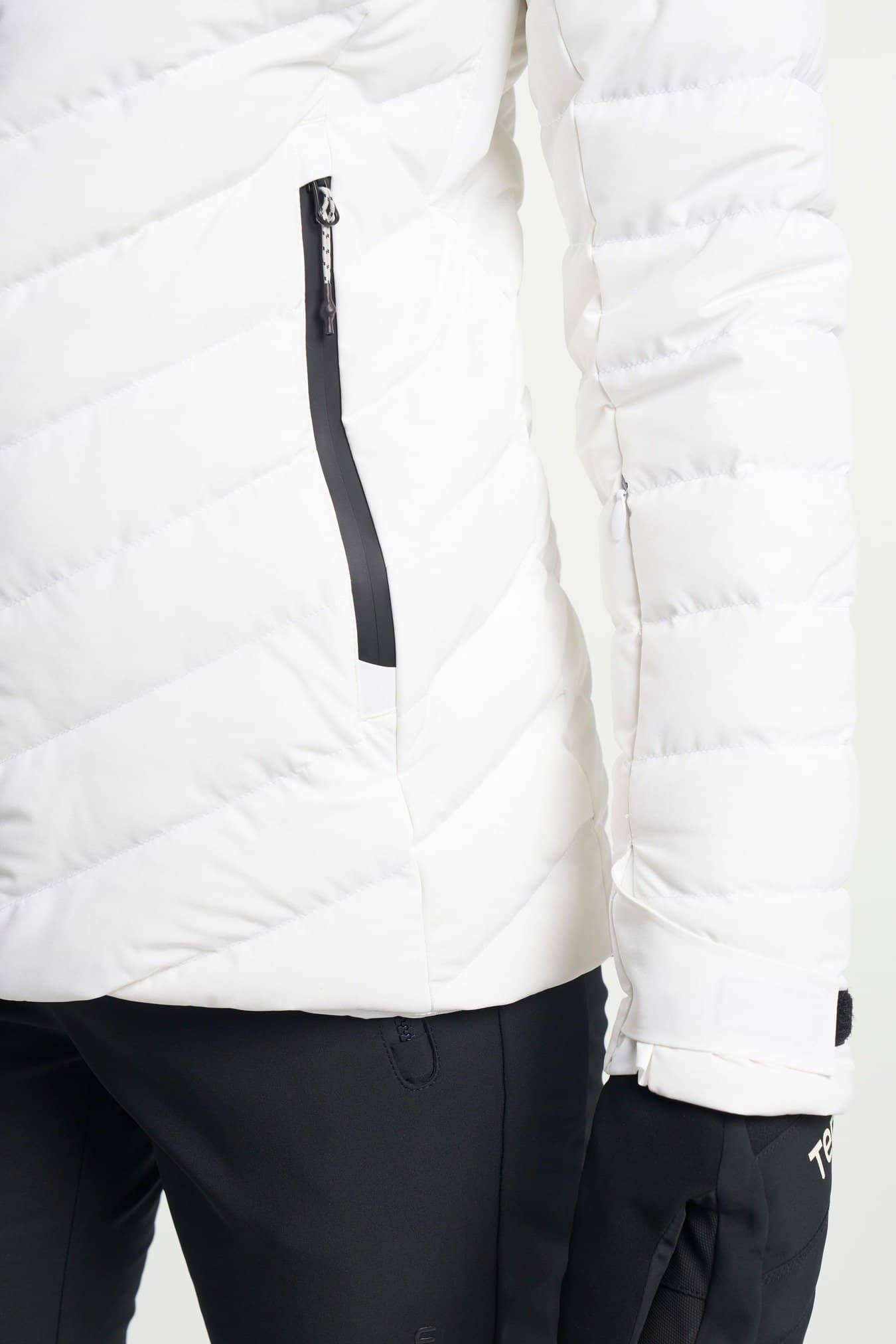 Adjustable cuffs, Adjustable hem, Adjustable hood, vertical and horizontal, Articulated sleeves, Detachable snowgaiter, Fill Power 600, Fixed hood, Fleece lined pockets, Folded chinguard, Hem adjustment, High collar, Inner lycra cuffs at sleeve ends, Innerpocket with elastic mesh, Innerpocket with zip, Insulation: Duckdown 90/10, Laminated brim, One chest pocket with zipper, RDS certified down, Ski pass pocket, Snow skirt: removable with zip, Two front pockets with zippers, Water repellent zippers, Ventilation under arm
