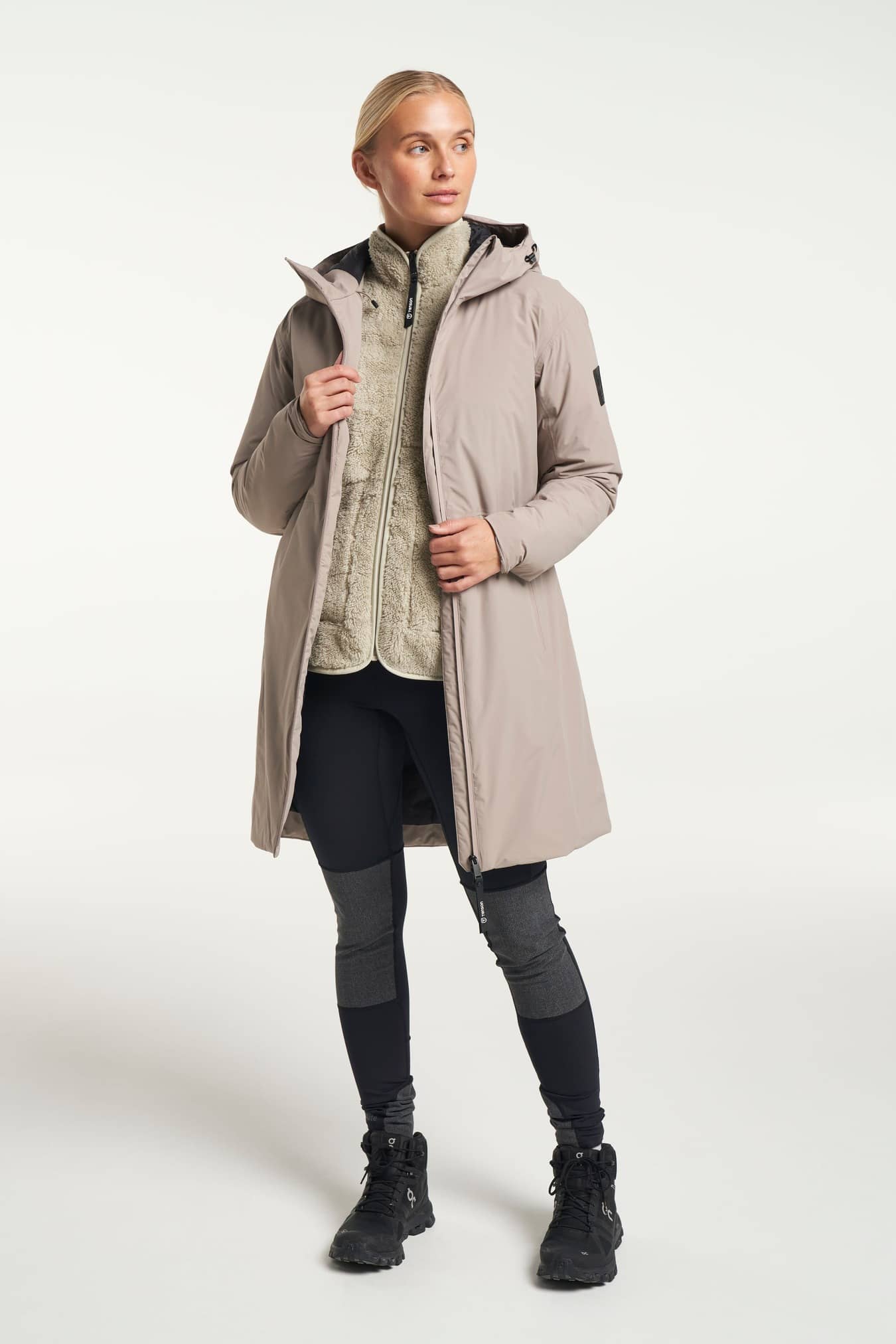 Die Shift Collection wurde entworfen und entwickelt, um einen nahtlosen Übergang von der Sommer- zur Herbstgarderobe zu schaffen, wenn das Wetter oft unvorhersehbar ist. Der Shift Coat ist ein klassisch eleganter, gefütterter und wattierter Regenmantel für Damen. Ausgestattet mit der von Tenson entwickelten MPC-Technologie (WP 5.000mm / MP 5.000 g/m2/24h) und versiegelten Nähten, kombiniert er extrem effektive Wasserdichtigkeit mit außergewöhnlicher Atmungsaktivität, damit du dich bei jedem Wetter wohlfühlst. Der Mantel hat eine voll verstellbare Kapuze und einen hohen Kragen, der den Wind vom Hals fernhält. Alle Nähte sind versiegelt und der Reißverschluss ist wasserabweisend, damit du auch bei Regen trocken bleibst. Dieser Mantel ist mit recyceltem AirPush Insulate™-Polyester gefüttert, das für zusätzliche Wärme sorgt. An der Vorderseite befinden sich zwei Taschen mit Reißverschlüssen, in denen du wichtige Dinge wie dein Handy und deine Brieftasche aufbewahren kannst, ohne befürchten zu müssen, sie zu verlieren. Außerdem hat er eine Innentasche mit Reißverschluss. Trage ihn in der Stadt und/oder in der freien Natur. Mit einer PFC-freien, wasserabweisenden Beschichtung.