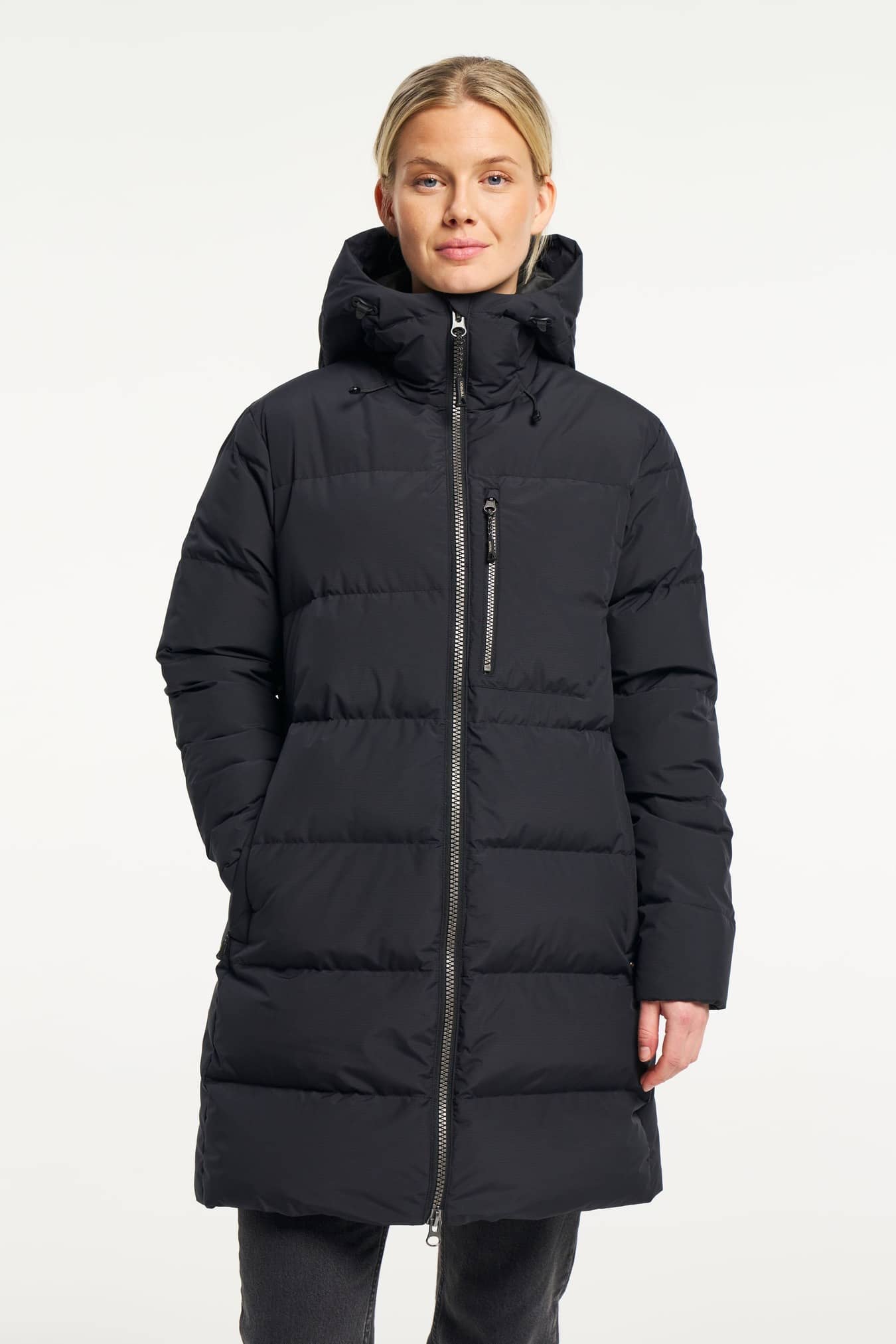 Dundas er en dunparka til kvinder, som er varm, stilfuld og komfortabel. Den er vind- og vandtæt, så du vil forblive varm og tør, selvom vejret ændrer sig. To-vejs lynlåsen giver øget ventilation og bevægelsesfrihed. Parkaen har brede kanaler fyldt med RDS-certificerede dun, som holder dig varm om vinteren, uden at det bliver for varmt på efterårs- og forårsdagene. Den justerbare hætte holder vinden og kulden ude. Jakken har to lommer foran og en kontrastfarvet brystlomme med lynlås.