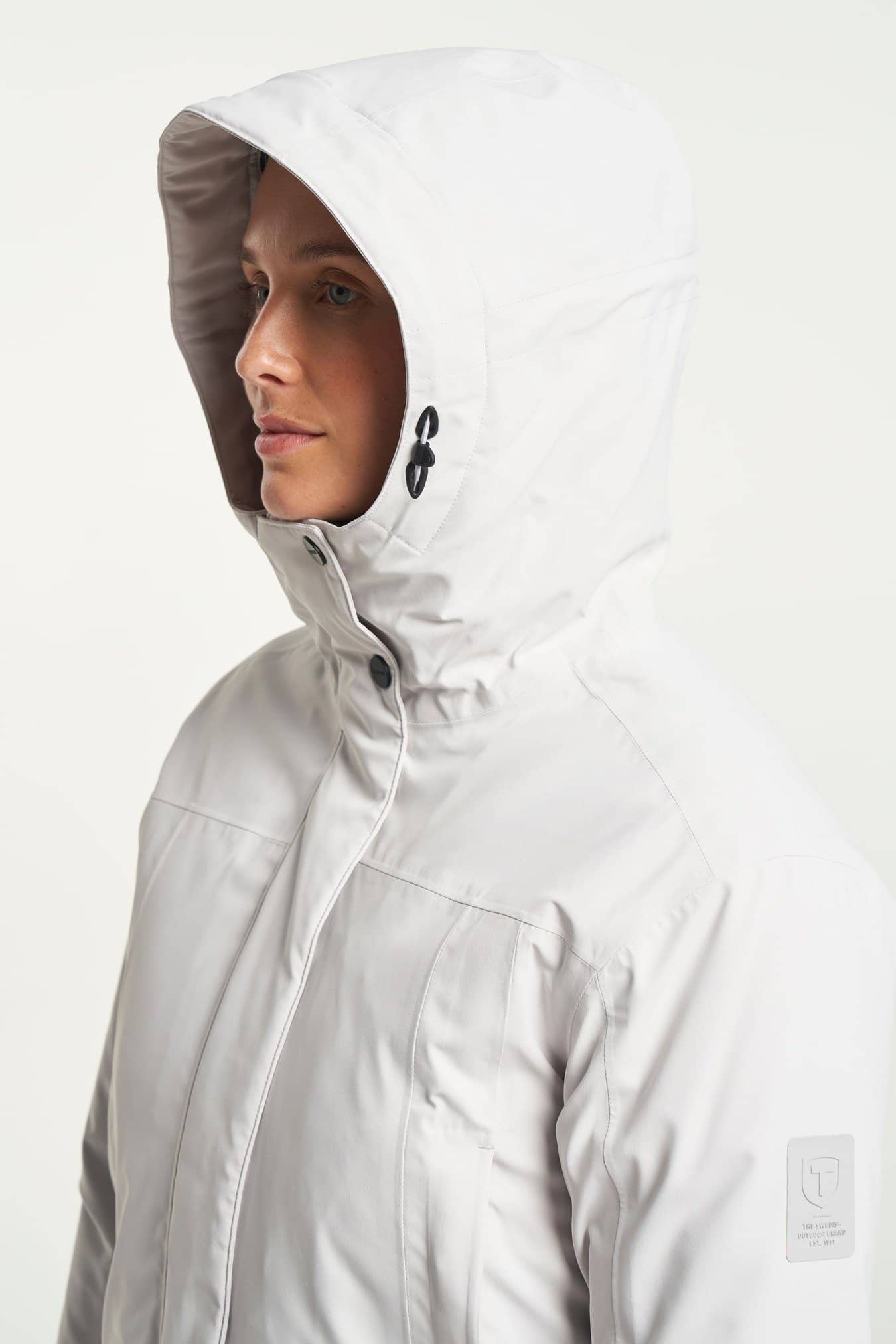 Eve Jacket er en klassisk vandafvisende dameparka med fast hætte. Udstyret med tapede sømme og Tensons egen MPC-teknologi (WP 5.000 mm / MP 5.000 g/m2/24 t), som kombinerer meget effektiv vandtæthed med enestående åndbarhed. På dage, hvor det er lidt varmere, kan lynlåsen åbnes i begge ender for ekstra ventilation. Den har to diskrete brystlommer med lynlås og to håndvarmerlommer, der kan åbnes foroven og i siderne. Har E-dye polyesterfor og en PFC-fri vandafvisende overflade.