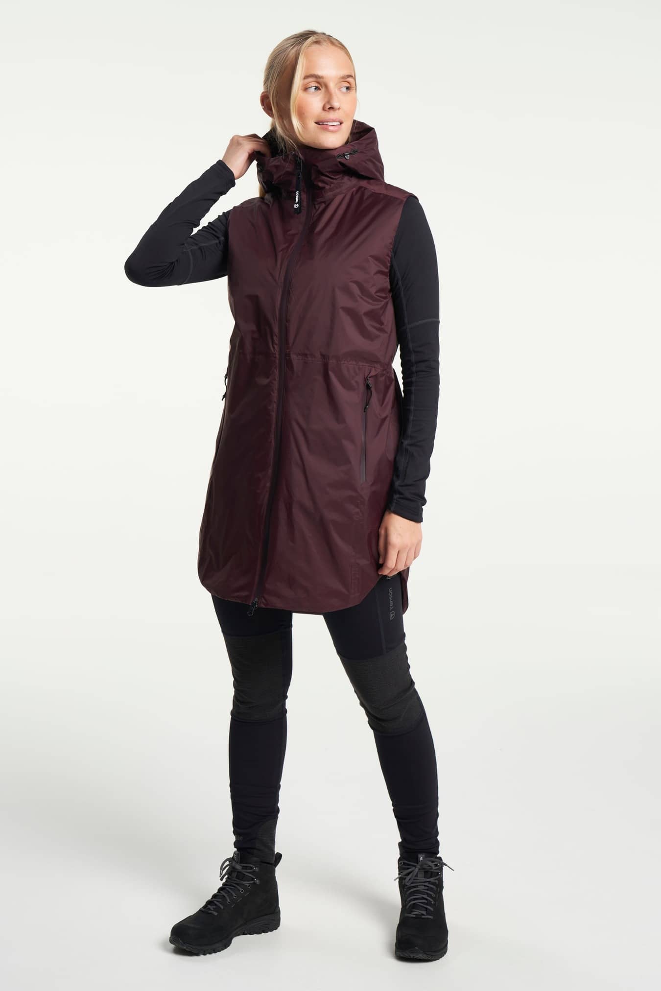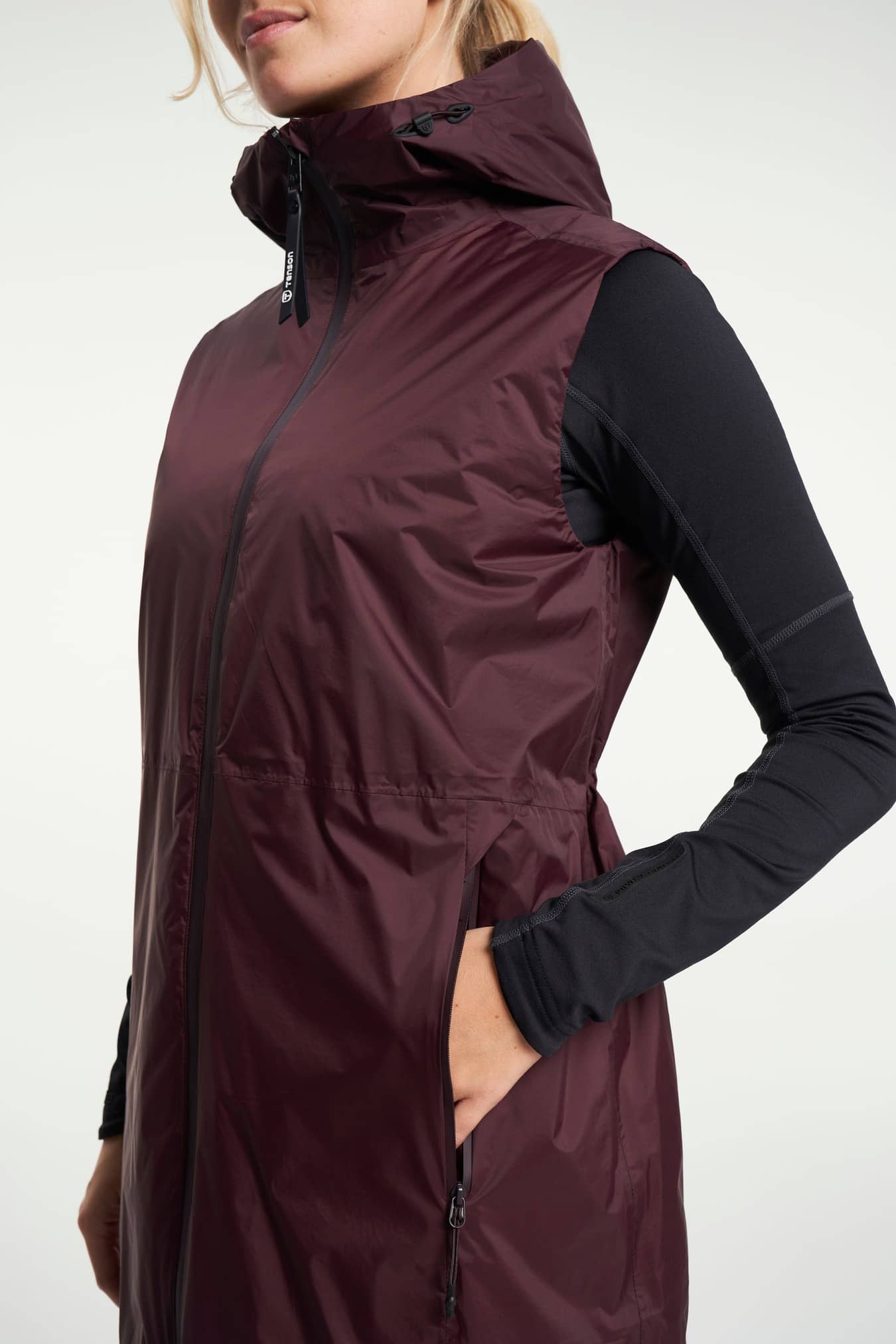Transition Vest er en Air-Push recycle-foret regnvest til kvinder i et klassisk, stilfuldt design med lang hætte. Tapede sømme og Tensons åndbare og vandafvisende MPC-teknologi beskytter mod vind, vand og kulde. Udviklet til dem, der ønsker en let, varmende beklædningsgenstand, som beskytter mod regn i foråret og efteråret, hvor vejret ofte er uforudsigeligt. For en ekstra elegant pasform har vesten en snøre i taljen, som kan justeres, så den sidder mere eller mindre stramt. Den er lidt længere bagpå som en fin detalje, men også for at du kan sidde ned uden at bekymre dig om at blive våd. På varme dage kan du ventilere ved hjælp af lynlåsen, som kan åbnes fra begge sider. Da det er en vest, er den også let at pakke eller have på under en jakke.