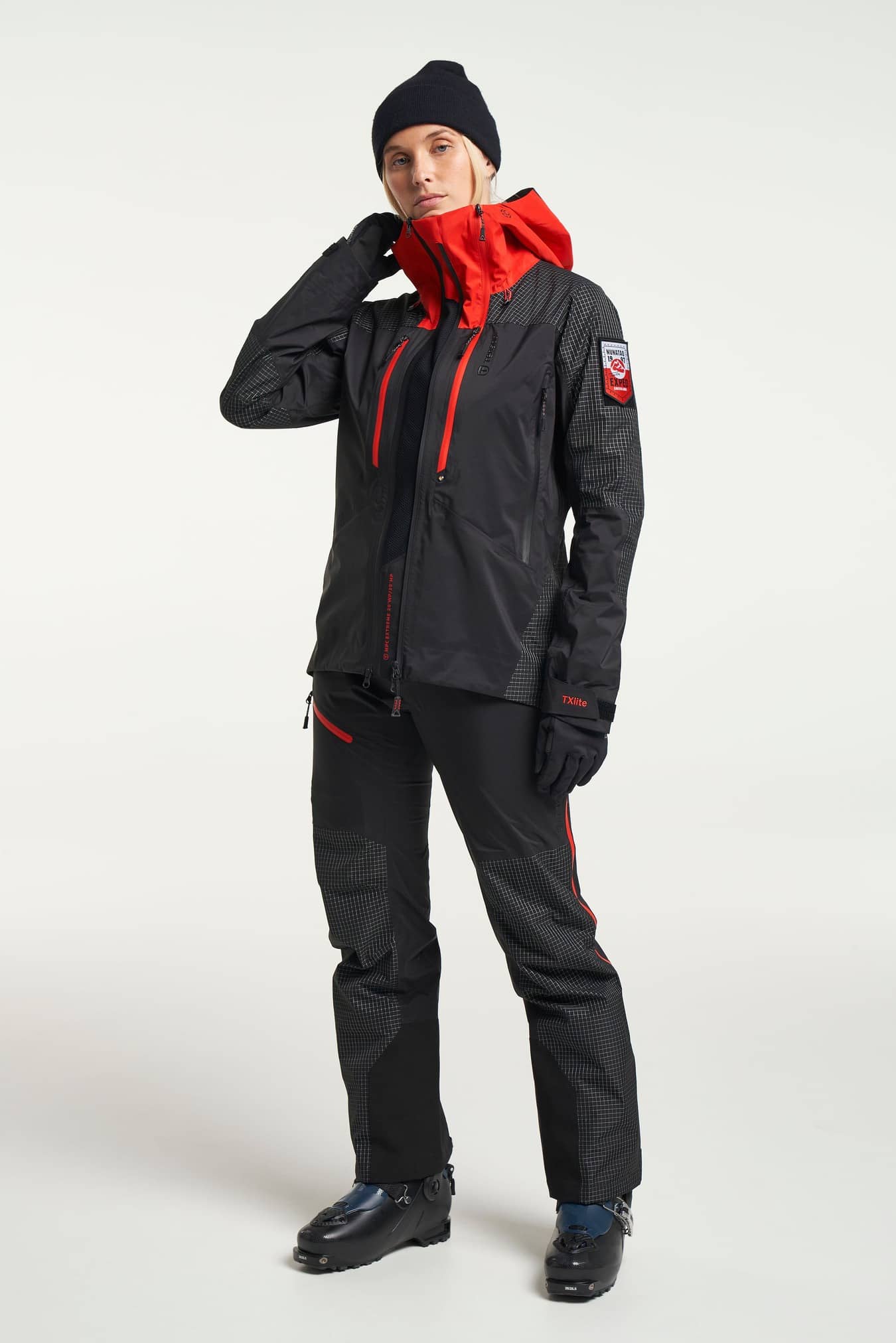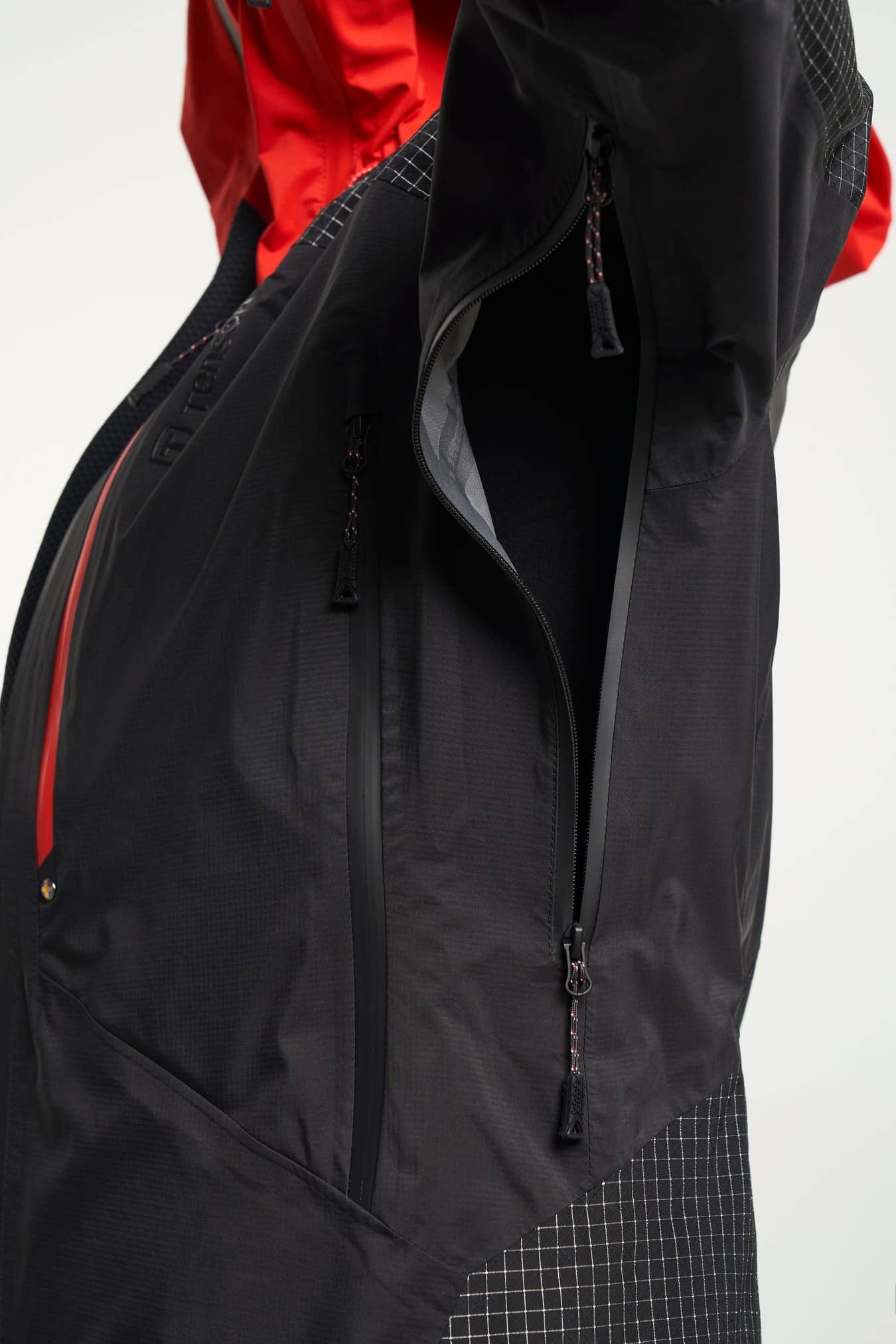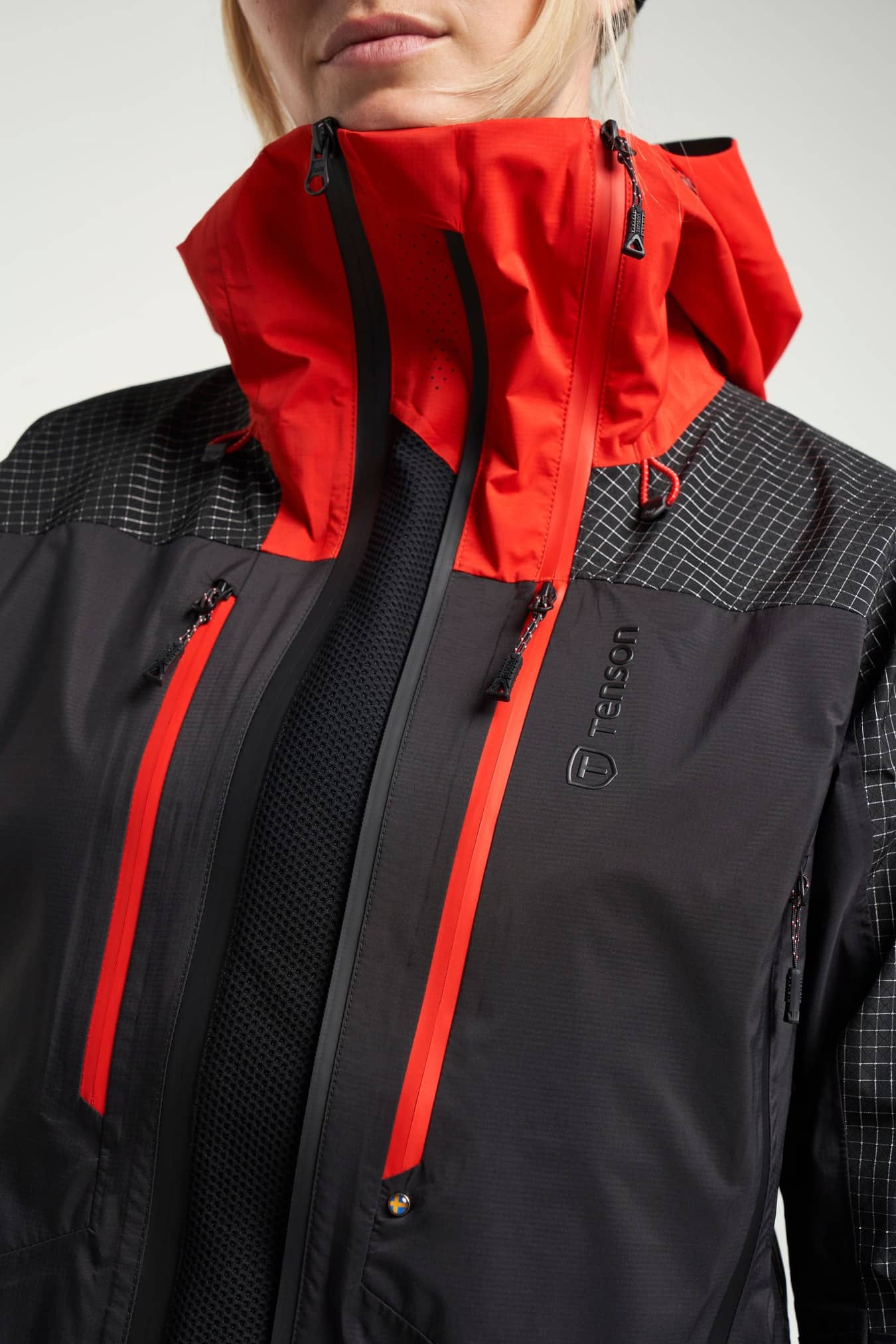 2 way zip, Adjustable cuffs, Adjustable hem, Adjustable hood vertical and horizontal, Articulated sleeves, Extension zip for back protection and helmet, Fixed hood, Fleece inside collar, Folded chinguard, Helmet compatible hood, High collar, Innerpocket with elastic mesh, Innerpocket with zip, Laminated brim, Laser-cut ventilation holes on front collar, Lycra cuffs at sleeve end with thumb holes, RECCO® Rescue system, Ski pass pocket, Taped seams, Two chest pockets with zippers, Two front pockets with zippers, Water repellent zippers, Velcro-adjustable sleeve straps, Ventilation