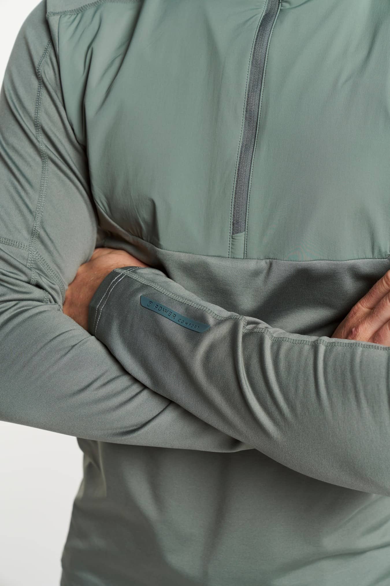 Articulated sleeves, Folded chinguard, Half zip at neck opening, High collar