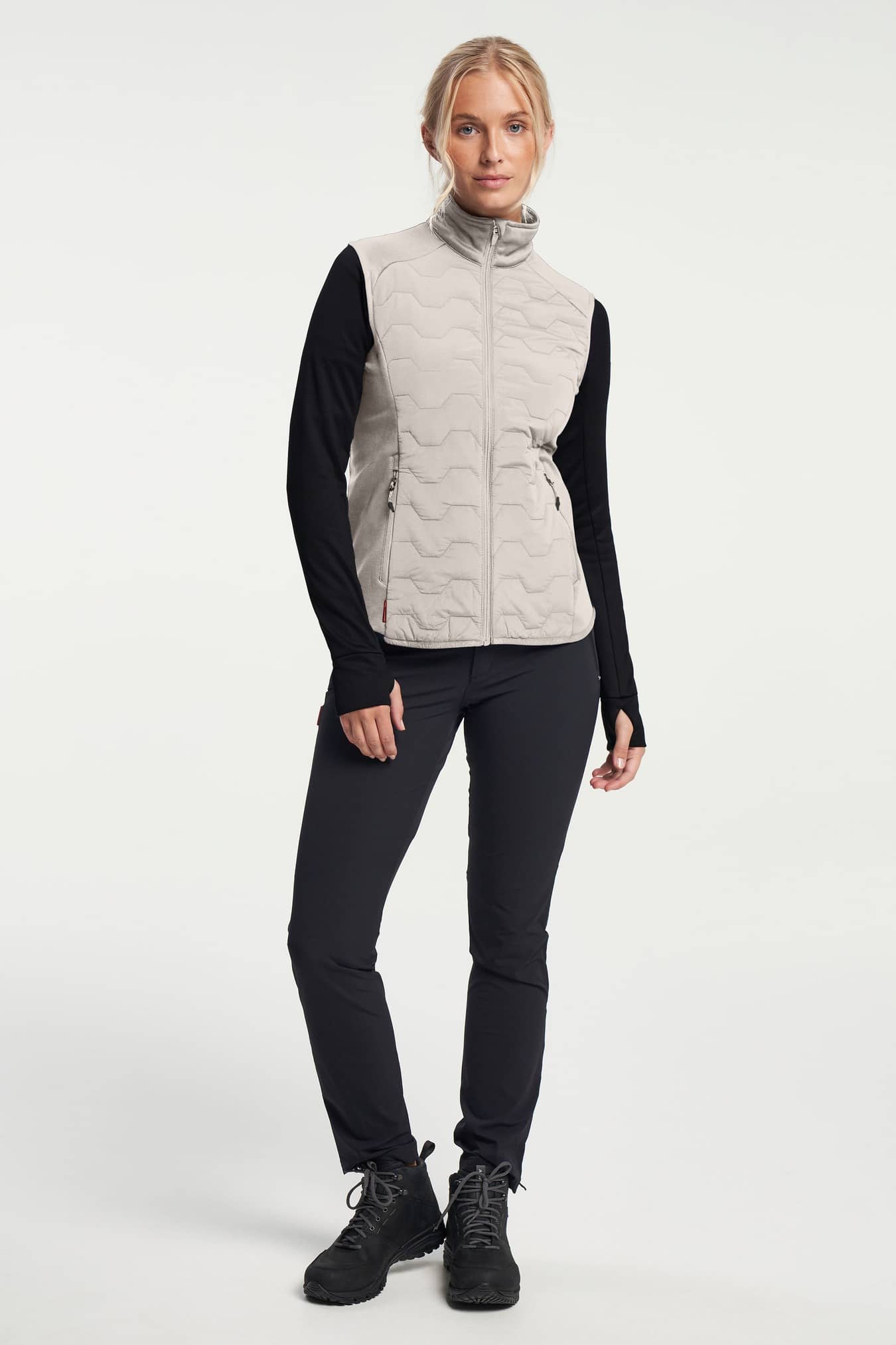 This lightweight, windproof and packable vest is made for adventure travel: Wear it as a vest on its own or as a mid-layer underneath a shell jacket when the temperature drops. The front and back are made from a stretchy quilted fabric with light padding in 100% polyamide. The sides are made of 90% polyester and 10% elastane. Both the waist and armholes are elasticated, and it has two zipped front pockets. The vest is windproof and has a raised collar to protect the neck.