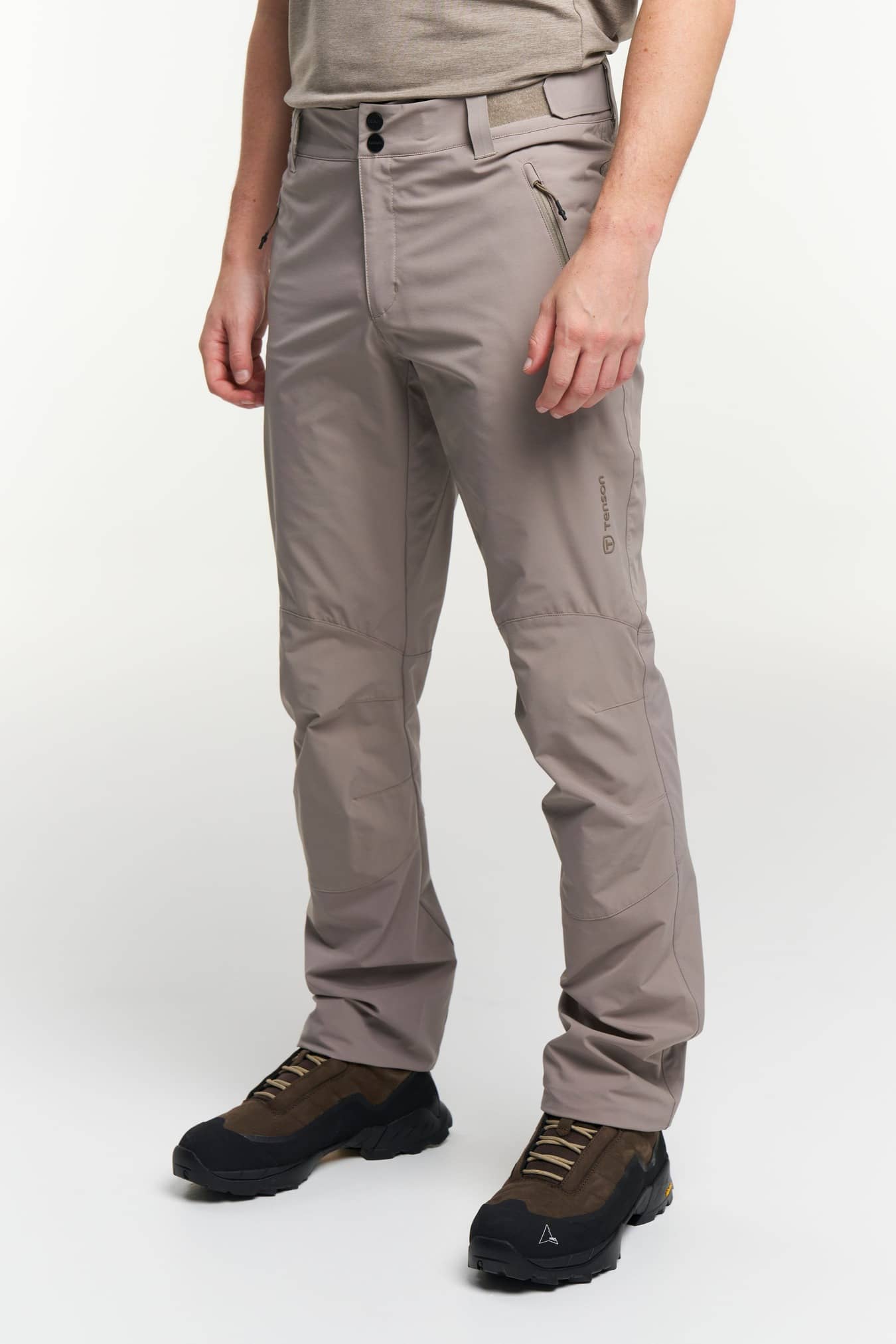 • Adjustable leg ending, Adjustable waist, Articulated knees, Two front pockets with zippers Shell fabric